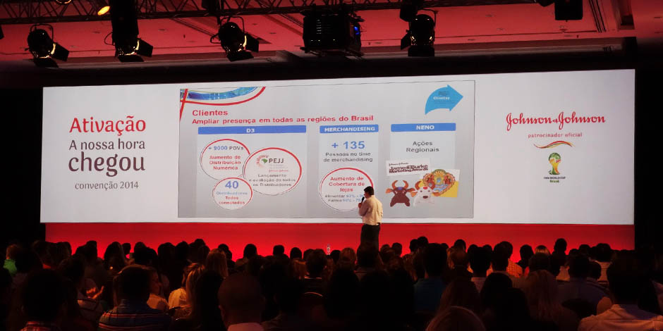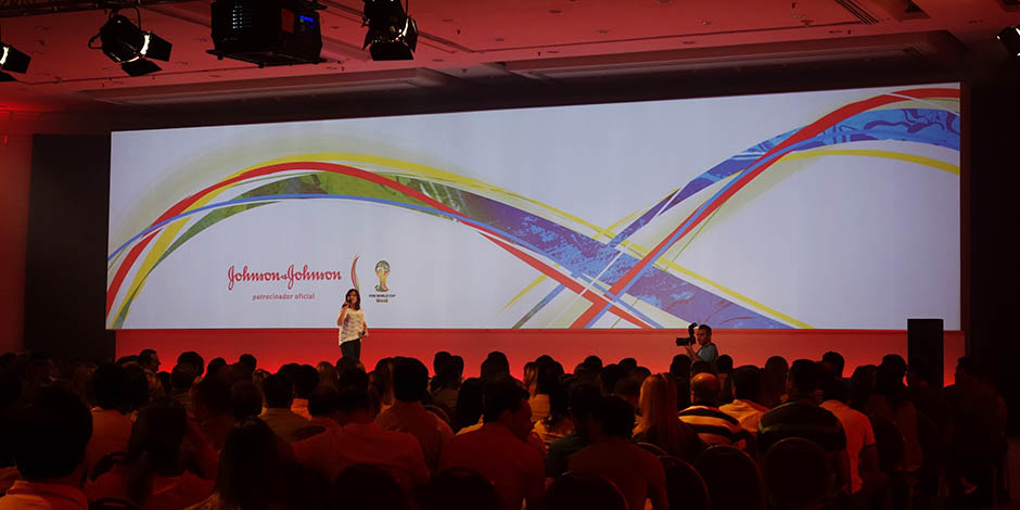 For the Brazilian branch of the Johnson & Johnson Company's annual presentation, a stage set was constructed with a panoramic screen and lit plinth that changed colors throughout the event. As a chance to relax for the guests, we set up a football pitch of synthetic grass in one of the ballrooms of the hotel.