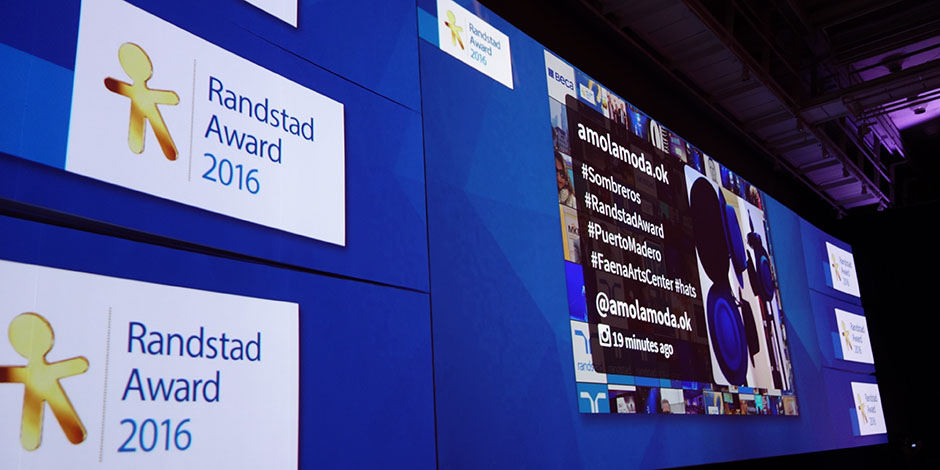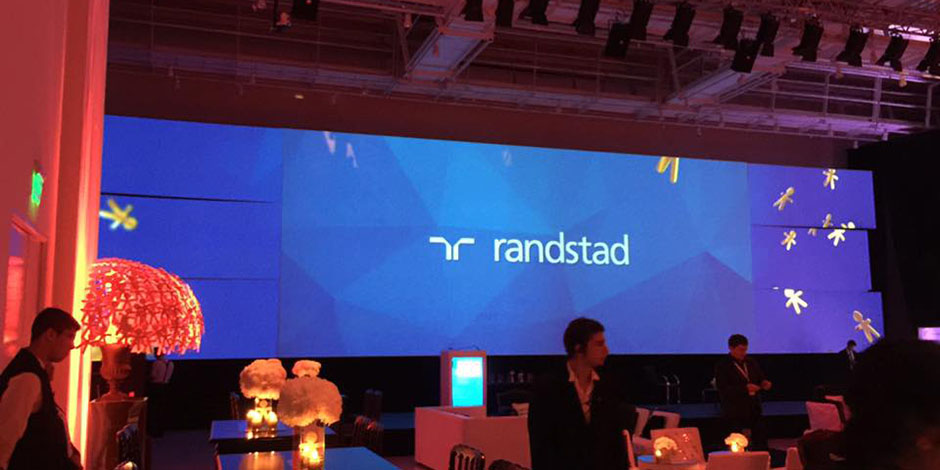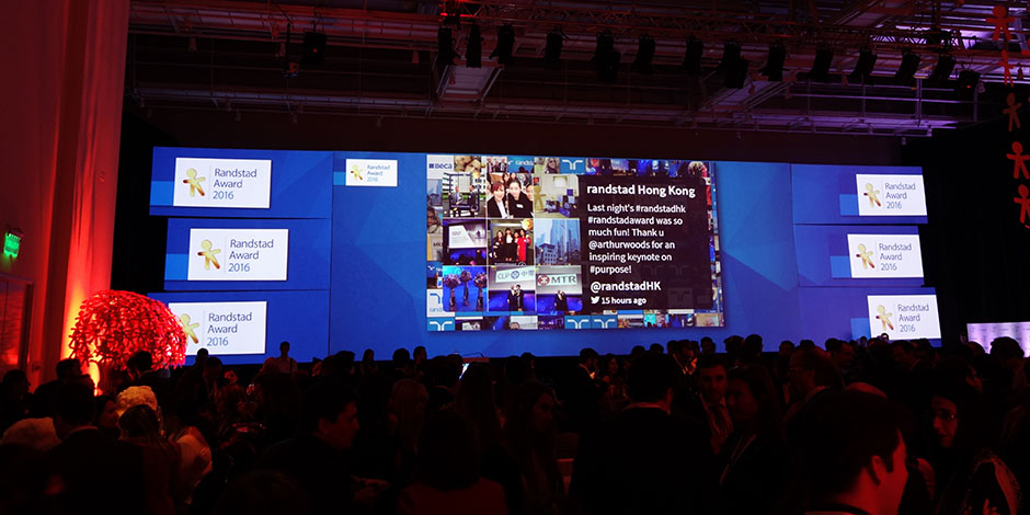 For the Randstad awards gala, 2MG.Net built a "winged" 30 x 18 ft. back drop which consisted of a large center screen between 6 curved projected surfaces on each side. Content for this show was completely developed and mapped by in house technicians.