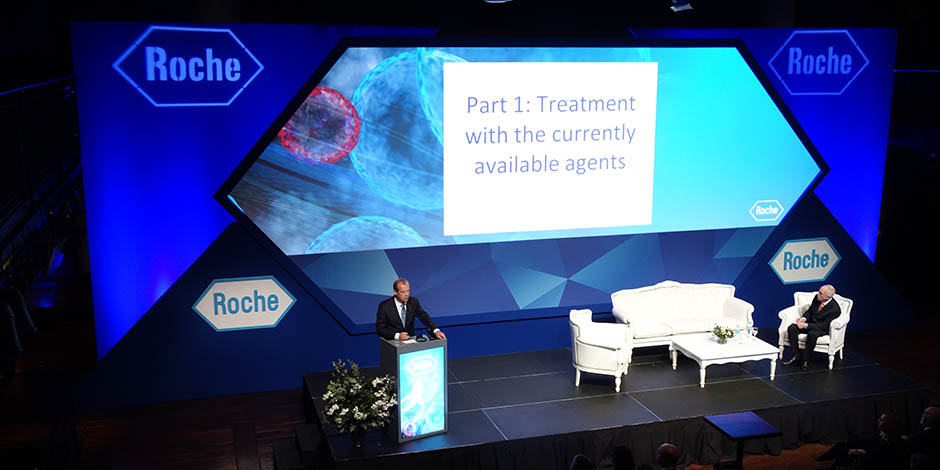 For a ROCHE Laboratories product launch at the "El Zanjón de Granados" venue, we constructed a stage set in the shape of a hexagon. This was inspired by the logo of the company itself. We developed and mapped a custom background with animated sequences whitin which, several independent video layers were used for camera live feed, presentations, and videos. On this occasion we provided and integral solution that included, lighting, photography, registration with mobile device support, staging, video, audio and simultaneous interpretation.