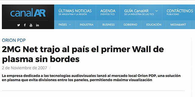 A news article published at Channel AR site (www.canal-ar.com.ar). 2MG.NET launches into the market the first wall plasma without borders.
